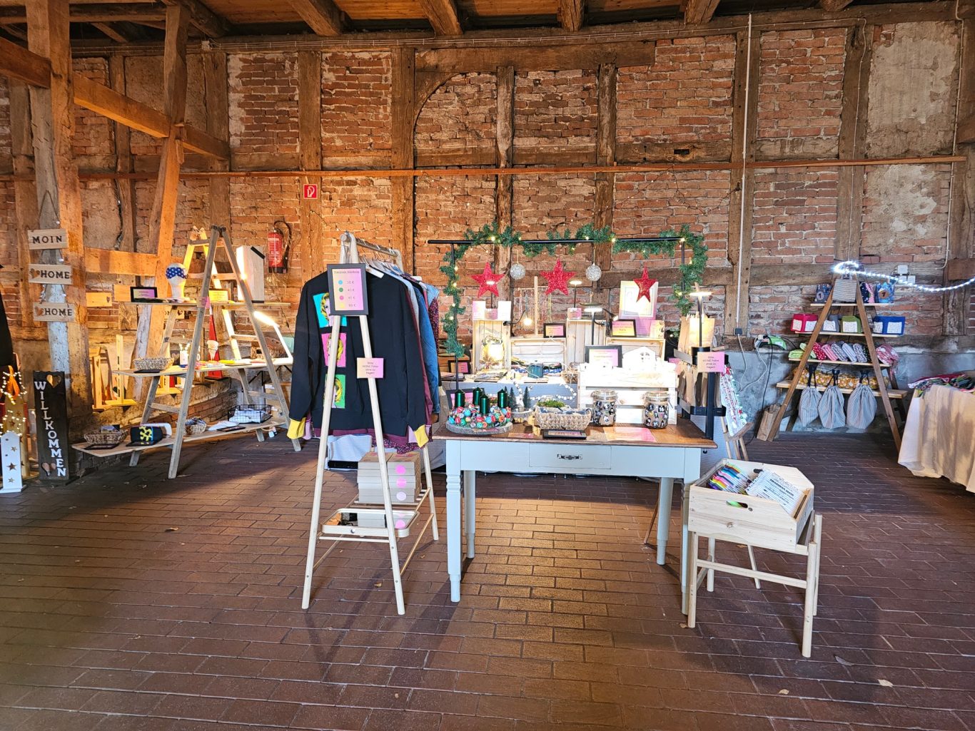 - 95% der Sachen habe ich selber hergestellt...5% kommen von anderen KünstlerInnen oder Kreativen. Zum Beispiel nehme ich im Moment manchmal das Buch "Mühlen, Schlösser, Fachwerk zwischen Weser und Hunte" von der Bremer Künstlerin Isa Fischer mit, weil sie selbst nur in Bremen auf Veranstaltungen unterwegs ist. Wenn das mitverkaufen der Werke anderer KünstlerInnen und kreativer Menschen nicht gewünscht ist, dann sagt mir dass bitte.