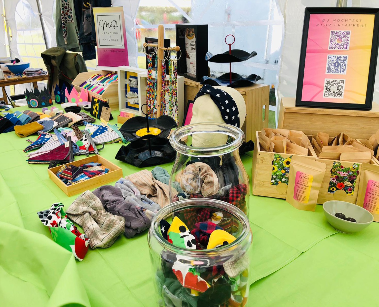 - Ich versuche immer, dass die Sachen, die ich herstelle, es so nicht bei bisher von mir gesehenen AusstellerInnen gab. Wenn es doch mal bei einem Artikel so sein sollte, unterscheiden sie sich ja trotzdem, da ich meine Schnittmuster immer selber entwickel und die meisten Sachen von mir upgecycelt sind. Mein Sortiment: Schmuck z. B. aus upgecycelten Lego- & Scrabblesteinen sowie Murmeln & Knöpfe; Nützlichen wie z. B. Teekannenwärmekissen, Schlafmaske, Reiseutensilio, Pixibuchhülle, Saatgutbomben in der Tüte oder aus einem alten Kaugummiautomat; Dekoratives wie z.B. Wimpelketten, Windfänger, Sonnenfänger; upgecycelte, nachhaltige Glückskekse; upgecycelte Kleidung und manchmal auch ein upgecyceltes Möbelstück; ich habe das "Wunschglas" und das "Momenteglas", sowie ein "Begegnungsbuch" entwickelt...das ist nur ein Teil meiner Produkte. Wenn du mehr oder etwas genauer wissen willst, dann melde dich gerne.